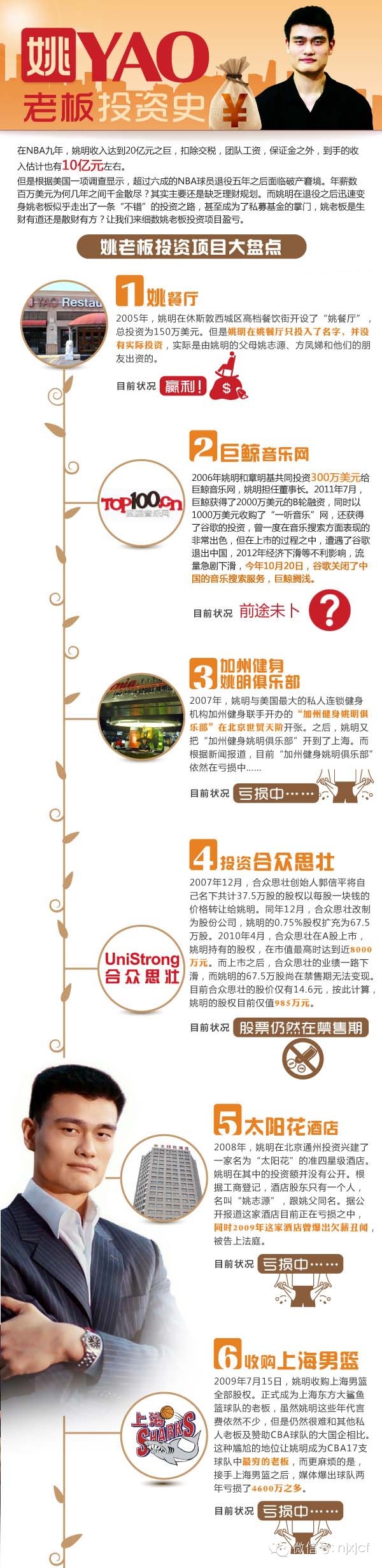 姚老板从篮球球员变身基金掌门,一路投资过餐饮业,互联网,酒店,健身房,酒庄等等,这么多投资有那些是赚钱的?姚老板到底是理财有方还是散财童子?小新为你来盘点。
