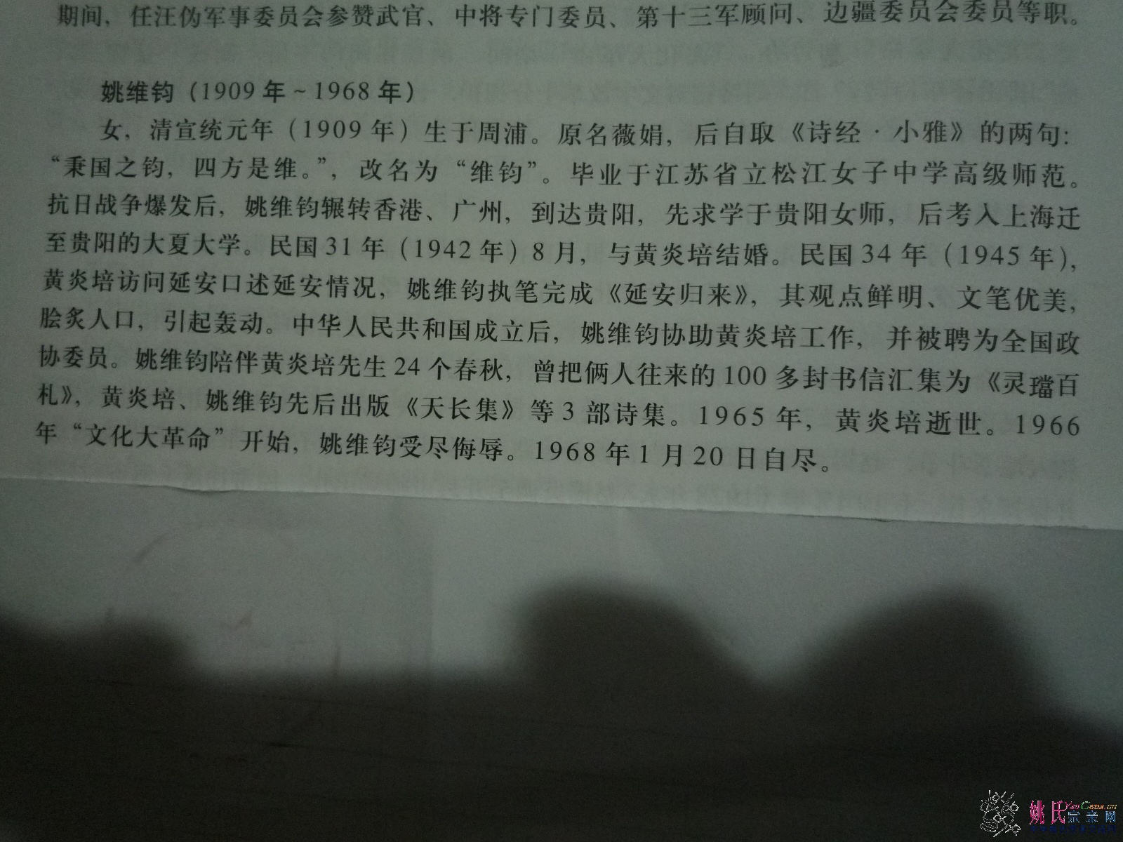 母亲以生命的代价,证实了求解这一难题之艰难。然而即便付出的是生命的代价,母亲在生命结束之际,仍然在留给我们姐弟和黄孟复兄弟的遗嘱中写道:“孟强、孟复、当当、丁丁、方方、冈冈:孩子们,我病得很苦!你们要跟着共产党……”与那个时代被害致死的多数人一样,母亲在告别人世之际仍无怨无悔,也无改其早年的政治抉择。在颠倒与迷乱的现实面前,她用一死来证明自己的清白,用奉献生命来唱和其早年的一腔热血!$ V2 R1 w; z1 p* t 所幸的是,那个罪恶的时代已经过去,中国已大步迈上改革开放的新进程。母亲执笔的这段对话,在新时期不仅常为薄一波等共产党元老提起,也不时为新一代执政的共产党人引用。可以告慰母亲在天之灵的是,40年后的今天,我们已经并将继续用自己崭新的足迹,一往无前地求索美好的明天,求索这个“黄炎培周期率难题”。' B9 B1 O6 |, a' c3 T; H, }. W 母亲百年诞辰之际,我想起40年前母亲撒手西去当夜,风吼雪哮,如天怒地怨,在我家阳台前,母亲天天在写字桌前与之隔窗相望的一棵半米粗的老杨树竟骤然腰折,扑倒在地,随母而去。或许忠魂有灵,或许生物有应,感天动地罢!其间,冥冥中总有一声音:维钧维钧,“秉国之钧,四方是维”也!更名维钧的姚维钧一生,恐正是应了“维钧”两字! 六十又三之我,无忘亡母在天之灵,作文以祭母云:母姚维钧,1909年生于上海浦东南汇。母父姚旭明,安徽黟县商贾,多有善举,服务乡里。母自幼聪慧,发奋读书, 志存高远,更名薇娟为维钧。抗战只身赴黔,读毕大学,1942年结缘吾父黄炎培,传书百封,唱和诗词,婚后育有二女二子。母长于文字,曾作序父诗《天长集》,并执笔父之名作《延安归来》,记录黄炎培与毛泽东著名对话,传颂天下至今。母忠厚贤慧,将被害之吾兄遗孤黄孟复兄弟和病故之吾舅遗女收至膝下抚养。建国后,母任吾父之秘书、全国政协委员,辅佐吾父之事业。极左猖獗时,民众遭殃,父为民请命,犯颜直谏而招忌遭压,吾三兄两姐被打成右派,母忍辱负重,艰于护夫,心力交瘁,几近崩溃。母为人正派,待人宽厚,体恤父之友人属下,口碑甚佳。“文革”后友人纷纷为母奔走伸冤平反。当时除吾等七孩儿外,父母尚需供养吾外祖母,补贴姑母舅母,经济不甚宽裕,母节衣缩食,克己甚严,且严教吾等年少便洗衣清扫自理生活。“文革”期间,母代夫受过,遭殴斗,然回家不言。 1968年初,母抱吾痛泣嘱托,又抱吾姨泣叙童年。1月19日礼拜六晚,吾离家归校,见母端坐锅灶前,为次日将回家之子女做饭,殊料竟为永诀。当夜,母以颤抖之手,提笔书遗嘱云:“孟强、孟复、当当、丁丁、方方、冈冈:孩子们,我病得很苦……”廿日晨,姨见母着廿余补丁棉袄,倒书桌旁,手边为安眠药片,奄奄将息,即抬上救护车,却胎漏母亡。吾等回家伏母大哭,二姐丁年与叶佩戎为母更衣,吾与黄孟复守灵通宵。是夜,风吼雪倾,如天怒地怨,晨见母书桌前窗外与母天天隔窗相望之半米粗杨树,竟已折断在地,随母而去矣! |